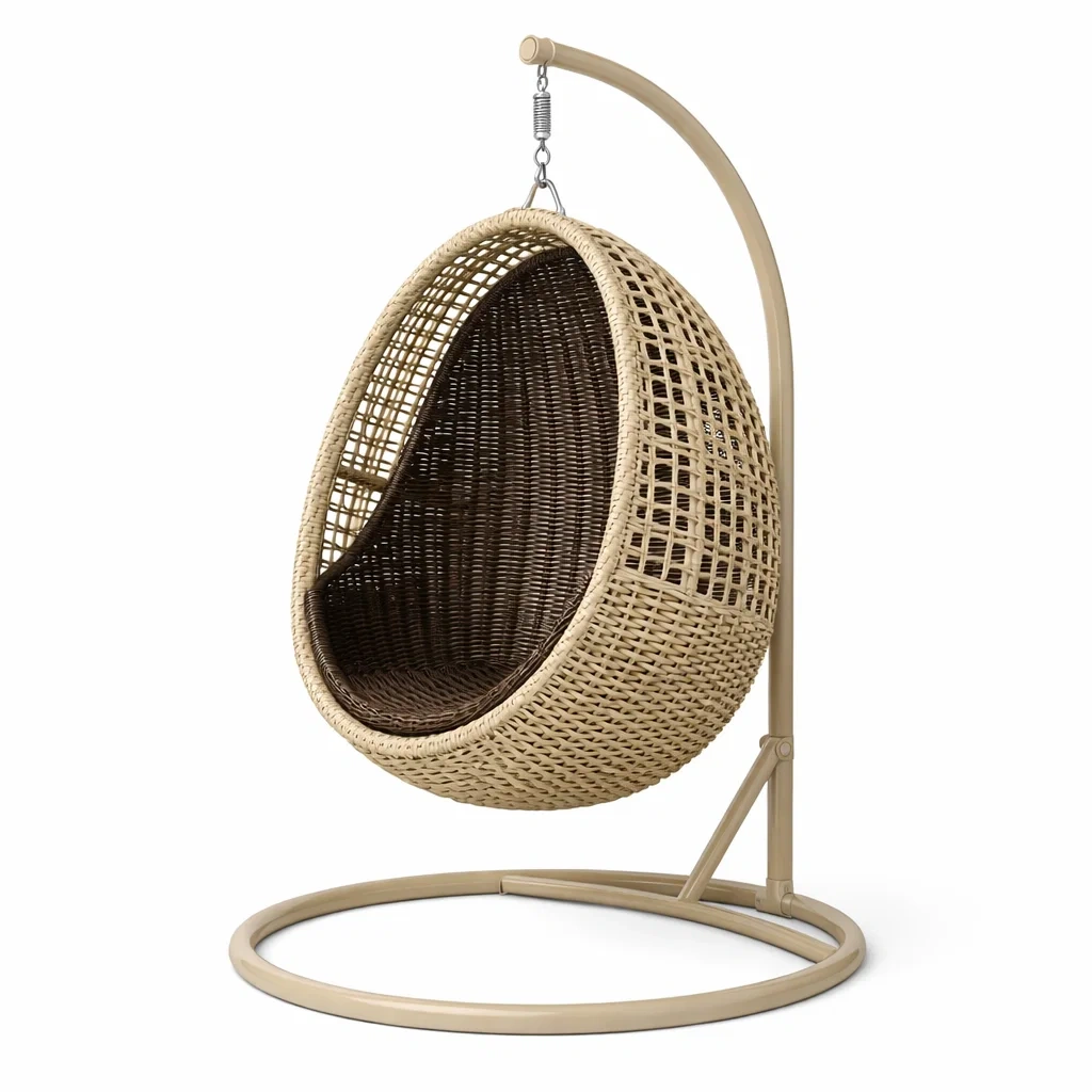 Eiförmiger hängesessel mit gestell aus polyethylen rattan beige braun mit stahlgestell
